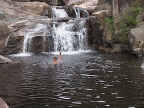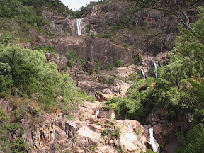 Dazu muss man sagen, dass die Jourama Falls ungefaehr 10 Kaskadenartig aufgebaute Becken hintereinander sind. Jedes Becken ist mit einem kleinen Wasserfall mit dem naechsten verbunden und so weiter. Diese kleinen Becken werden nicht umsonst als "Pools" bezeichnet! Extrem klares, sauberes Wasser eignet sich super zum schwimmen. Grade weil es sehr kuehl war, war es nach den Klettereinlagen in der prallen Sonne immer wieder erfrischend. Ausserdem muss angemerkt werden, dass wir nur in Badehosen unterwegs waren (ohne Schuhwerk oder andere "Hilfsmittel") und deswegen auch keine Kamera mitnehmen konnten. Zu gerne haetten wir Fotos von der geilen Landschaft gemacht die uns immer wieder atemberaubende Motive gegeben hat, doch zu diesem Zeitpunkt konnten wir das einfach nur geniessen. Wirklich eine geile Tour!